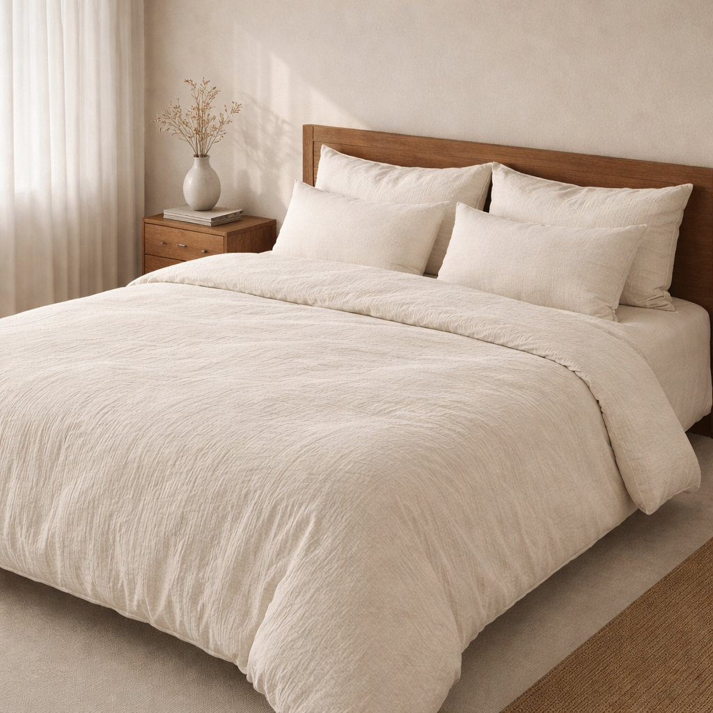 Minimal tasarımı ve doğal dokusuyla yatak odanıza sıcak, sade ve huzurlu bir atmosfer kazandırır. Müslin kumaşın hafif kırışık ve yumuşak yapısı sayesinde ekstra ütü gerektirmez; pratik ve konforlu bir kullanım sağlar.