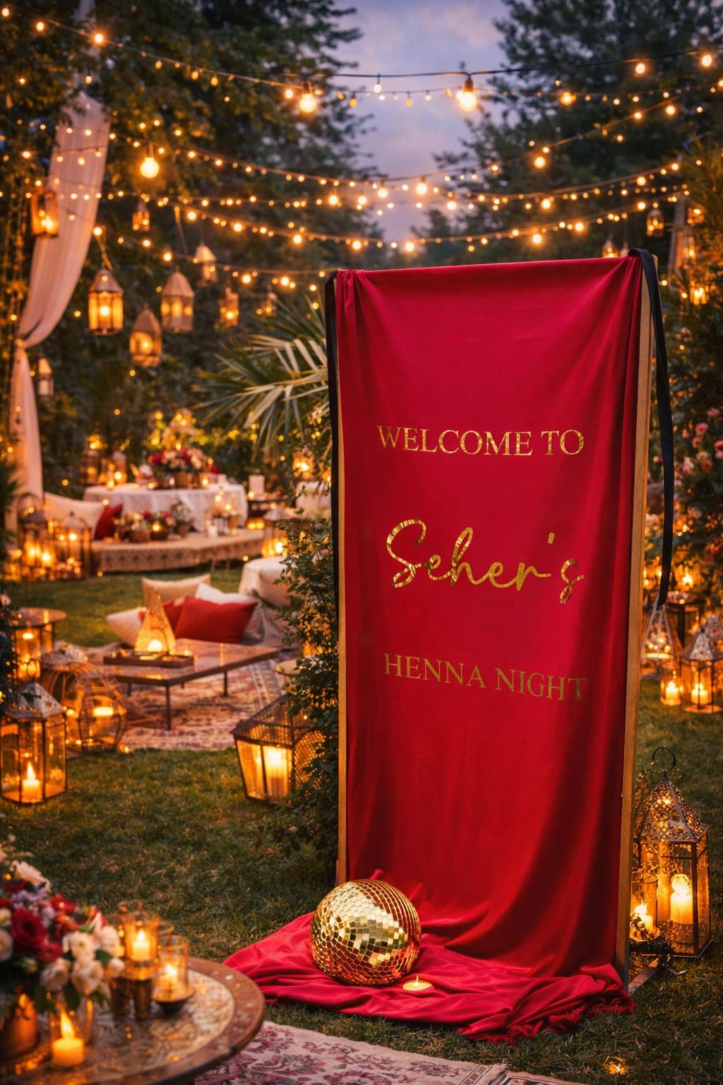 Kırmızı kadife karşılama panosu (70×200 cm). Kına gecesi ve özel davetler için gold veya gümüş baskılı lüks hoş geldiniz panosu. Şimdi keşfet.